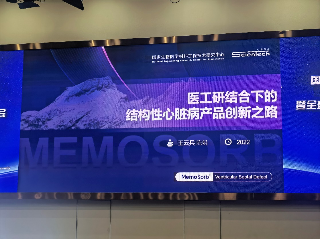 王云兵教授和乐普心泰医疗陈娟董事长做了题为“医工研结合下的结构性心脏病创新之路”的报告,介绍了MemoSorb全降解封堵器系统的创新研发历程。产品研发中,基于国际公认的组织诱导性生物材料理论,在不外加药物、活性细胞和生长因子的情况下,在全球率先通过可降解材料及器械的植入实现了心脏缺损部位组织的修复再生,即通过材料自身组成链段结构、三维微孔结构、降解周期等的精细调控,实现了封堵器动态力学支撑及降解性能与组织修复良好匹配,避免了传统金属封堵器植入后永久存留于儿童体内可能带来的远期并发症风险。