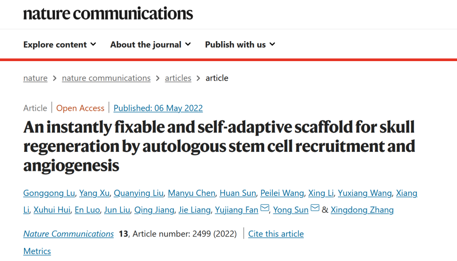 近日,张兴栋院士团队樊渝江教授和孙勇研究员课题组在Nature Communications上发表题为“An instantly fixable and self-adaptive scaffold for skull regeneration by autologous stem cell recruitment and angiogenesis”的研究论文。论文共同第一作者为博士后卢恭恭、博士生徐扬;华西医院神经外科惠旭辉教授,华西口腔医院颌面外科罗恩教授,生医学院/生材中心蒋青教授,四川医疗器械生物材料和制品检验中心梁洁教授等专家共同参与了该项研究。