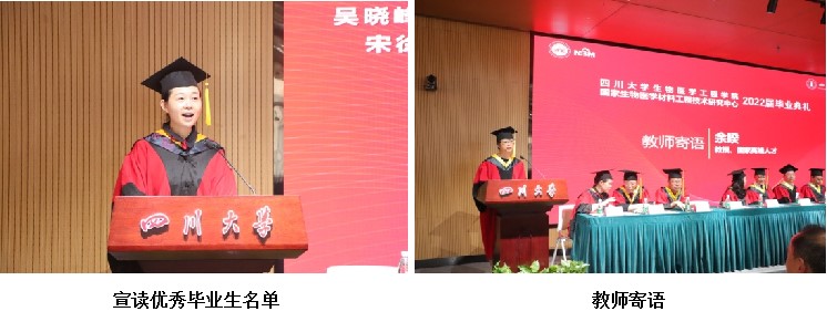 本科生代表张嘉煜同学以生动的语言重温了在校期间的生活画面,引起了诸多同学的共鸣。她代表全体本科毕业生,表示未来将一定不辜负学校与学院的关心与教导,以优秀的成绩彰显川大生医人的风采。毕业研究生代表刘坤鹏同学回忆自己的学习生活以及在实验室里的点点滴滴,对学校及学院给予的帮助与支持表达了衷心的感谢,并对母校、对学院和即将毕业的同学们表达了美好的祝愿和真挚的祝福。