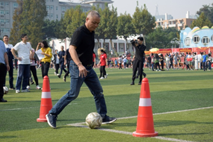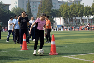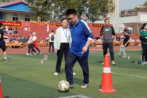 绕杆踢球射门是一种很有趣的比赛项目,它不仅能够考验个人的运动协调能力,还能增强团队之间的凝聚力。绕杆是人对球的控制,需要老师们保证动作的质量和连贯性,射门时老师们也十分注意身体的重心和踢腿的幅度,努力控制球前进的方向和速度。不论是青年组还是中年组的老师,都沉着应战、一丝不苟、努力控制着脚下的足球,灵活穿梭在绿茵场上。