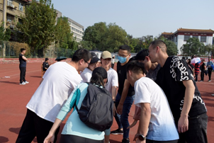 抛球入筐需要老师们将手上的球精确地投入面前的小筐内,不同于投篮,这里的小筐背负在队友的身上,这极大地考验了老师们的默契,老师们需要在心中计算出投掷的力度和高度才能保证小球顺利进入筐内,团队总计数的形式也给比赛增添了更多的配合。老师们一个接一个进球时开心的呐喊、差一点但绝不气馁的鼓励,化作了运动场上最美的交响乐。