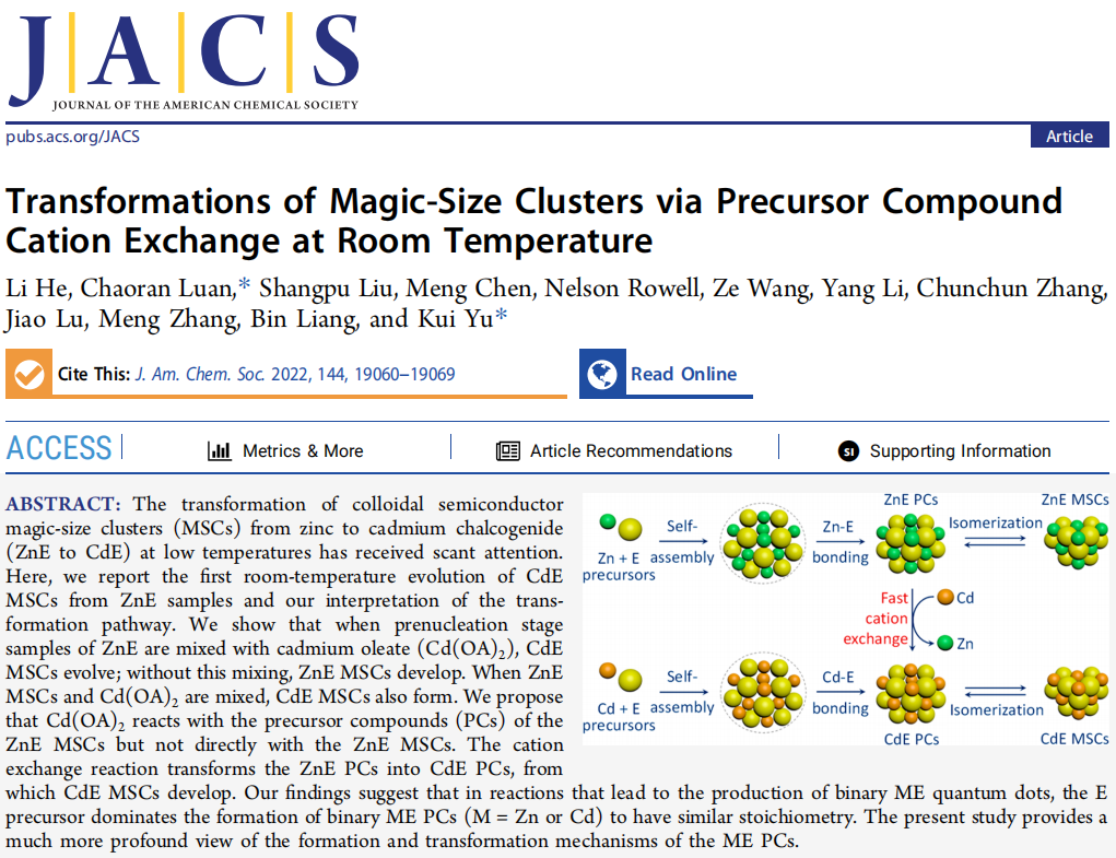 近日,国家生物医学材料工程技术研究中心/原子与分子物理所余睽教授团队长达五年的关于二元ZnE幻数团簇到CdE幻数团簇的室温阳离子交换的研究工作,在化学领域权威期刊J. Am. Chem. Soc杂志得到发表,题目为“Transformations of Magic-Size Clusters via Precursor Compound Cation Exchange at Room Temperature”。论文第一作者为国家生物医学材料工程技术研究中心博士生何丽,余睽教授和栾超然博士为论文共同通讯作者。工口漫画