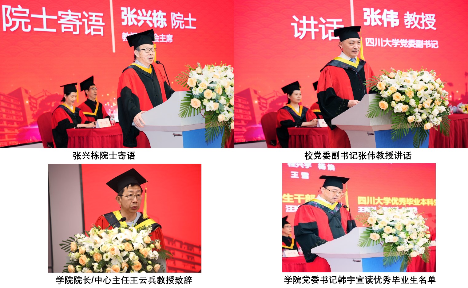 学院院长/中心主任王云兵教授做了毕业致辞。王院长首先衷心祝贺各位毕业生同学们学业圆满、前程远大。在临别之际,王院长也对毕业生同学们提出五点希望:一是希望大家保持赤子之心,胸怀家国,无论未来职业选择如何,都要始终牢记时代使命、家国担当。二是希望大家在未来的工作中秉承川大生物医学工程的优良传统,在不同的岗位上都能抓住机遇,关注学科前沿,大胆创新,天道酬勤。三是希望大家心有所向、无问西东,成功永远都属于那些坚守理想、坚持不懈的人,梅花香自苦寒来,人间正道是沧桑。四是希望大家恪守底线、心存敬畏,大家经历了多年大学精神的浸润,希望将大学精神的实质贯穿未来一生。五是希望大家保持本真、心怀热爱,生活总是丰富多彩,希望不仅有理性的视角,更有热烈的情怀去感悟生活之美,历尽千帆,归来仍是少年。最后,王院长希望同学们记住母校港湾的灯永远为大家照亮护航。