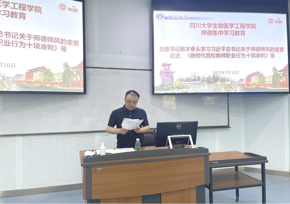此次集中学习教育大会以师德师风建设为主题,学院党委书记韩宇首先做了主题发言。他带领全体教工集中学习了习近平总书记关于师德师风的重要论述,接着对《新时代高校教师职业行为十项准则》、《教育部关于高校教师师德失范行为处理的指导意见》以及学校开展师德集中学习的实施方案进行了深入的领学和详细阐释。韩书记强调,学院/中心要通过开展师德集中学习教育,全方位全过程强化师德培养,筑牢为党育人、为国育才的初心使命,引导全体教师敬业立学、崇德尚美,营造风清气正的育人环境。