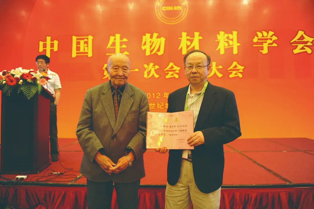 2012年6月,师昌绪院士为张兴栋院士(右)颁发中国生物材料学会第一届理事会理事长聘书。