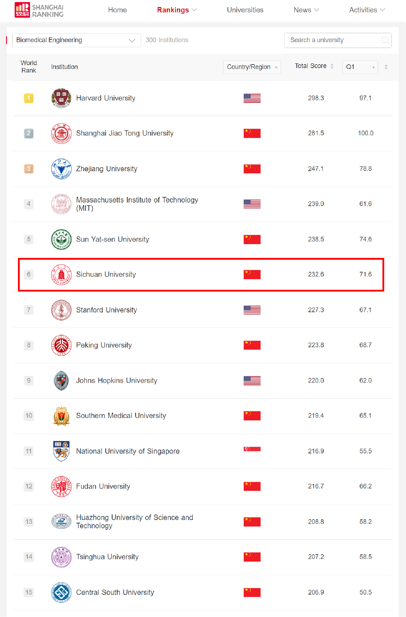 生物医学工程学科获得232.6总分,较2022年上升4位,位列世界第6位。