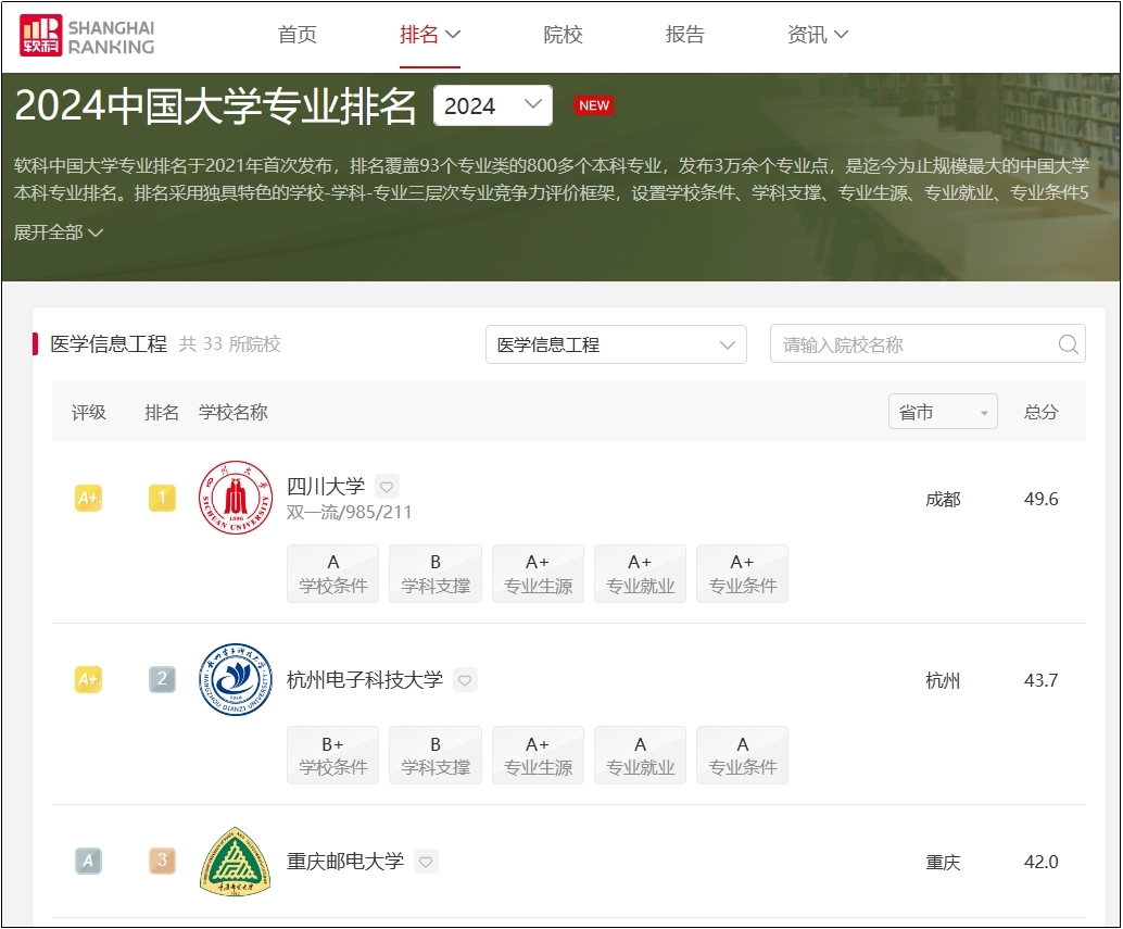 图1 2024软科中国医学信息工程专业排名前三的高校(来源于//www.shanghairanking.cn/rankings/bcmr/2024/080711T/)