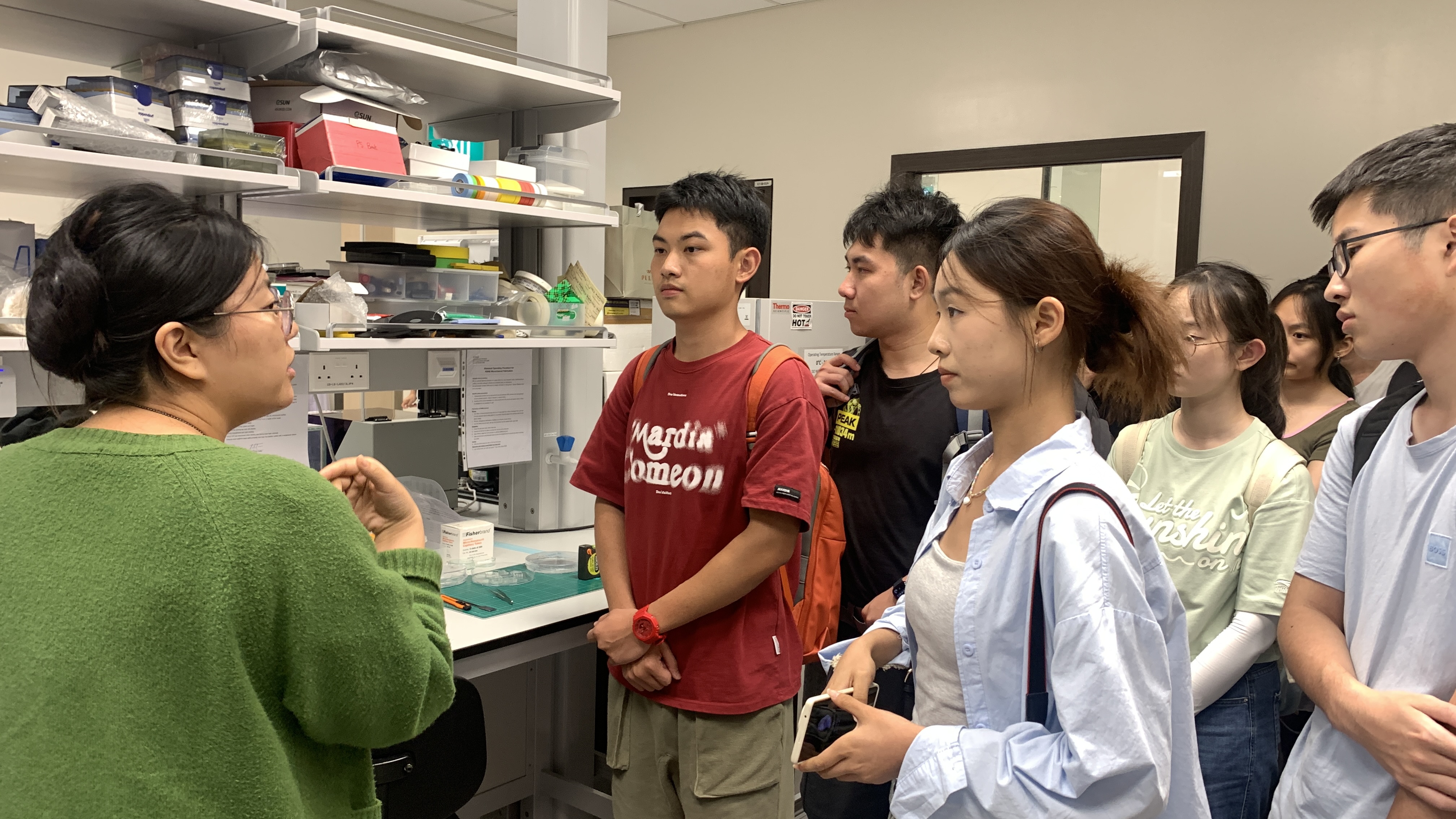 在本次参访中,来自新加坡国立大学材料系的薛军民教授、生物医学工程系的李俊教授以及从事人工智能研究的李强工程师分别作相关领域讲座,与同学们分享了自己课题组的前沿学术进展。薛军民教授阐述了光触发的可切换金属和氧气氧化还原可提高水电解效率的最新发现,李俊教授主要介绍了新型超分子聚合物作为生物材料的应用,李强工程师则通过实际应用举例说明了生成式人工智能的原理和正确使用方法,同学们在交流与思考中受益匪浅。讲座结束后,同学们跟随本校研究生参观了不同的实验室,了解它们各自的研究特色。
