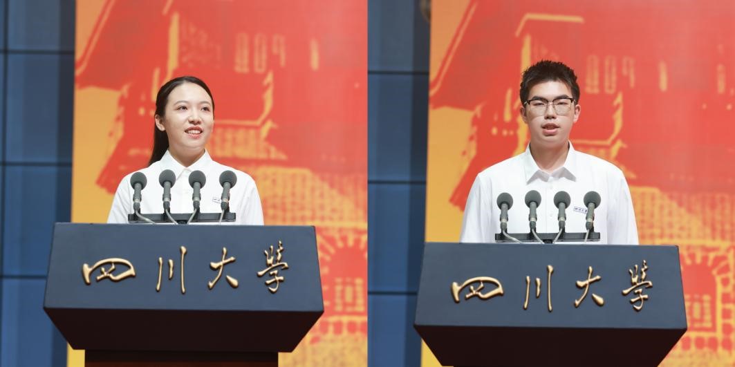 在校生代表、华西口腔医学院2021级本科生黄睿和新生代表、古典学系2025级本科生黄世豪同学在发言中向学校、师长和父母的培养表示衷心感谢。他们说,作为新时代的川大人,我们将不悔所选、不负所学,以赤子之心,求学业精进,在传承中创新突破,在奋斗中勇毅前行,书写属于新一代川大人的青春篇章。