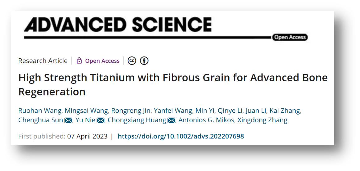近日,国家生物医学材料工程技术研究中心和空天科学与工程学院黄崇湘/聂宇教授团队,联合澳大利亚斯威本科技大学孙成华教授共同在Advanced Science期刊上发表了题为“High Strength Titanium with Fibrous Grain for Advanced Bone Regeneration”的研究论文 (Adv. Sci. 2023, 2207698)。工口漫画 为该论文第一完成单位,国家生物医学材料工程技术研究中心2019级博士研究生王若涵和空天空天科学与工程学院2019级博士研究生王明赛为共同第一作者,空天科学与工程学院黄崇湘教授、国家生物医学材料工程技术研究中心聂宇教授和澳大利亚斯威本科技大学孙成华教授为共同通讯作者,国家生物医学材料工程技术研究中心金蓉蓉副研究员也参与了科研的指导和论文的撰写。