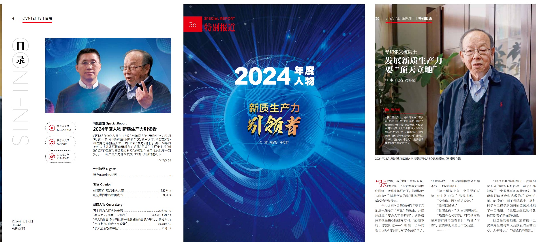 2024年12月,张兴栋教授被人民日报主办的《环球人物》杂志遴选为“2024年度人物 新质生产力引领者”,并在《环球人物》2024年第24期,总第531期以《发展新质生产力要“顶天立地”》为题进行了特别报道。