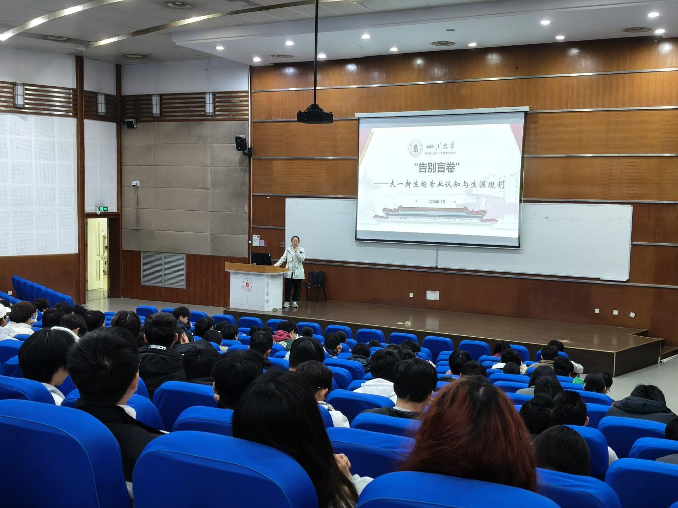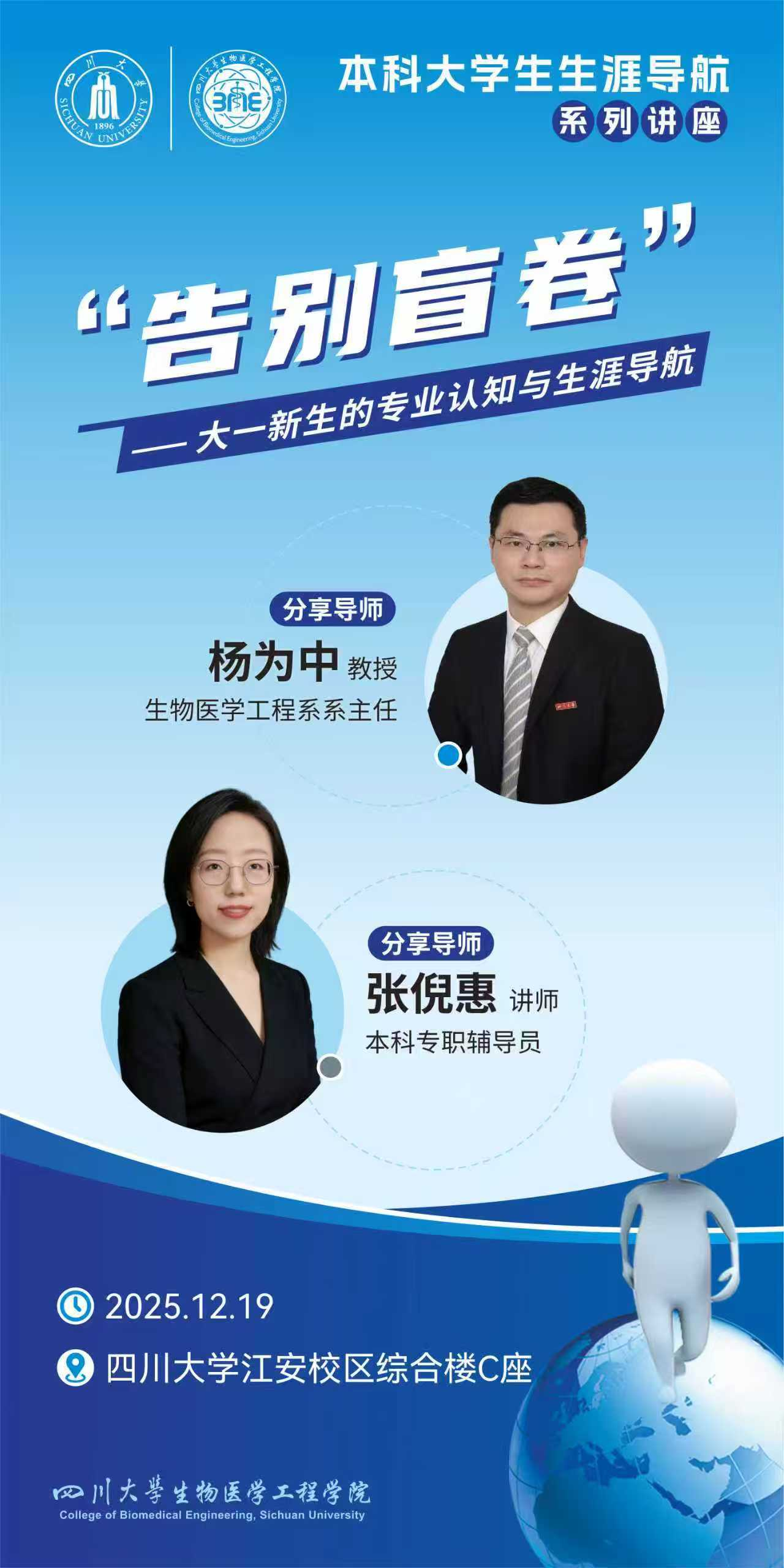 同日面向大一新生的讲座主题为“‘告别盲卷’——大一新生的专业认知与生涯导航”。生物医学工程系系主任杨为中教授与本科专职辅导员张倪惠老师联袂主讲,为入学三个月的新生提供系统指导。
