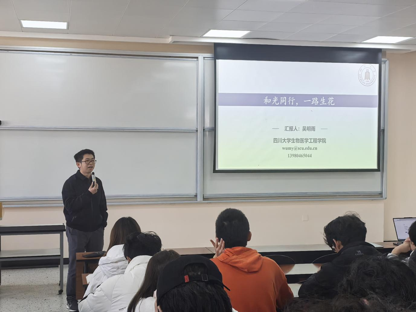 12月5日,首场讲座面向大二年级学生举行,主题为“破‘卷’前行:生物医学工程人的成长辩证法——不困于节点,深耕终见曙光”。学院副教授吴明雨与特聘副研究员曹舜泽以“过来人”身份,结合自身求学、科研与生活经历,与同学们展开深度交流。