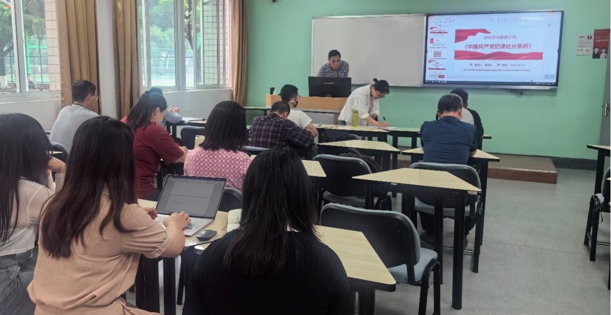 党支部书记黄忠兵教授首先介绍了党中央、教育部及校党委要求开展党纪学习教育的会议内容以及相关的工作部署;同时,发表了主题汇报,黄老师介绍了去年修订今年实施《中国共产党纪律处分条例》的必要性及修订主旨,同时强调了共产党员需要严格贯彻执行纪律处分条例。黄忠兵老师还要求支部全体党员会后加强对纪律处分条例细节的学习,特别是对新修订内容的学习。