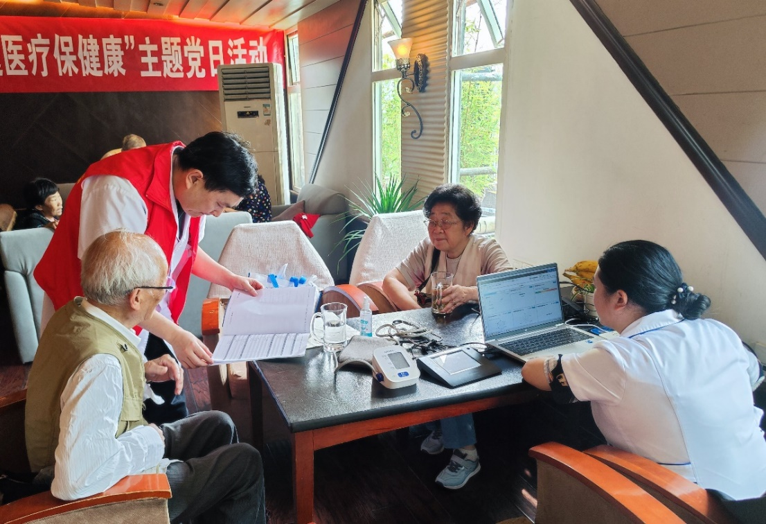 望江路卫生服务中心主任、党支部书记沈海英、副主任贺福珍、办公室主任郑庆、以及王旭副主任医师、黎萍主管护师、张燕中医师等医护人员,现场设立工作站,为老同志们测血压,测血糖,细致解读体检和病历报告,进行健康咨询等,对老同志们现有的用药方案进行指导,并建立健康档案方便后期回访,送上了零距离的关心与呵护。